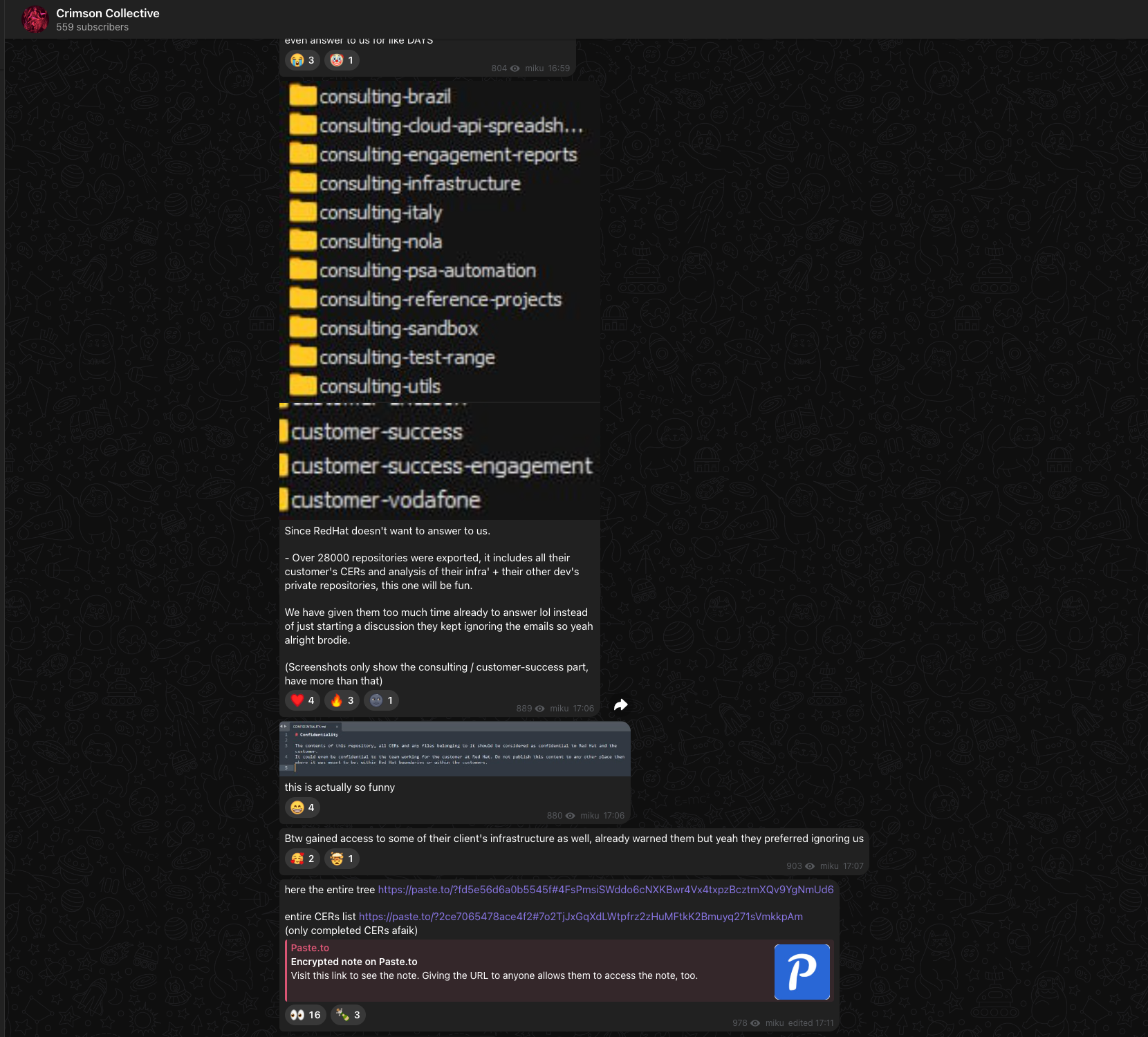 Crimson Collective’in 1 Ekim’de Telegram kanalında paylaştığı mesajlara göre, Red Hat’in kendilerine günlerce geri dönmediğini belirtmişler. Bu da gerçekleştirilen saldırının, 1 Ekim’den çok daha önce yapıldığına işaret ediyor.